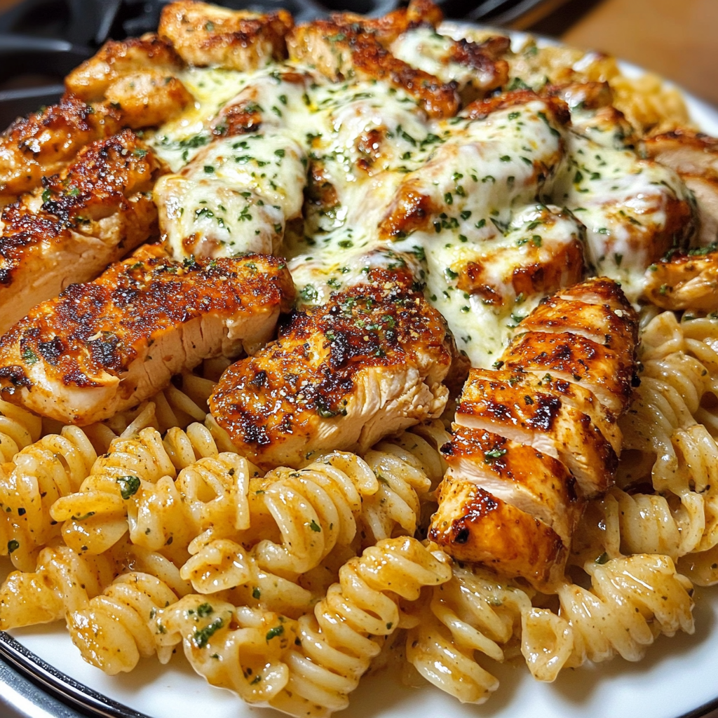 Creamy Cajun Butter Chicken Rotini includes rotini pasta, chicken breasts, butter, heavy cream, and Cajun seasoning, topped with mozzarella and Parmesan cheese.