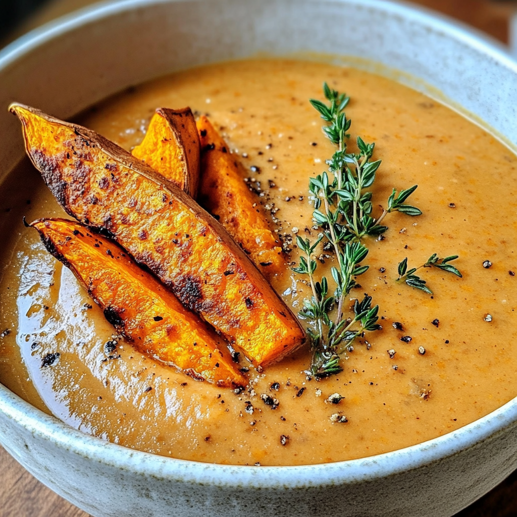- Ladle soup into bowls; garnish with reserved roasted sweet potato wedges and fresh thyme sprigs.